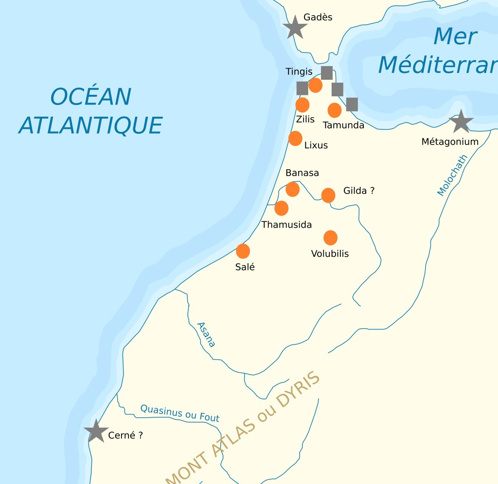 A l’Ouest du continent, le Royaume de Maurétanie aurait été fondé par le mythique roi Atlas. Selon la légende, il a été changé en pierre pour le punir de son inhospitalité, donnant naissance au massif montagneux qui porte son nom encore aujourd’hui. La capitale de la Mauritanie était Volubilis (Oualili, dans la province marocaine de Meknès). Les Maurétaniens faisaient du commerce avec les Phéniciens, puis les Carthaginois, à travers les ports puniques de Tingis (Tanger) et Lixus (Larache).