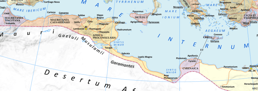La présence romaine en Afrique du Nord a commencé après la chute de Carthage, lorsque Rome a pris possession des derniers territoires carthaginois, qui sont devenus la province d’Africa. À partir de là, les frontières romaines se sont d’abord étendues vers l’Est, sur la Tripolitaine, puis la Cyrénaïque. En -27, année de la fondation de l’Empire romain, le premier Empereur Auguste a également pris possession de l’Égypte. À l’Ouest, la Numidie et la Maurétanie, gouvernées par des rois clients de Rome, seront annexées par les successeurs d’Auguste.