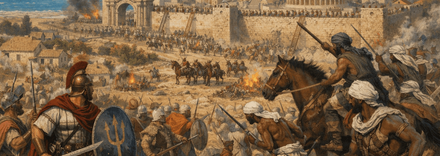 Les villes antiques de Leptis Magna et Oea (Tripoli) ont été rivales depuis leur fondation. Au printemps de l’année 70, les habitants d’Oea ont profité d’une crise interne à l’Empire romain pour déclarer la guerre à leur vieil ennemi. Avec l’aide des Garamantes, ils ont attaqué Leptis Magna et ravagé la campagne environnante.